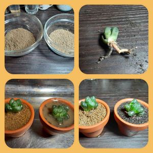 これは、赤玉土との配合だよ。 1:1だね。水はけは良いかな。 昨日作った、腐葉土との配合は、比率を2:1にしたよ。粘性が強すぎて、水が鉢底から出なかったからね。🧒🏼 なるほど。明日は? 川砂を使ってみるね。🧒🏼 その3鉢で経過観察だね。🕷 そうだね。🧒🏼