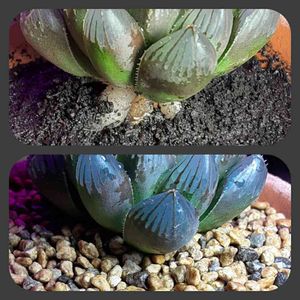 葉がジュレてる!🕷 そうだよ。左右の葉にも、ジュレた葉の跡形がついてるね。🧓 ヤバくない?🕷 だから、綺麗にして植え替えだね。🧓 どうしてジュレたの?🕷 下葉が用土に埋もれてるからだよ。表面の用土は赤玉土つかってるしね。保水性がある用土だから、葉にも付いてるだろ。🧓 加湿だね。それって過失だよね。 ................。まあ。🧓 この時期は、起こりやすい。 防止する方法は?🕷 植え方で防止出来ると思うよ。🧓 どうやって?🕷 それは、今度ね🧓 このハオ、あった? 今日、買ってきたんだけど。