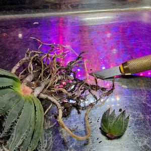 カッターで三箇所に刃を入れて、 子株を取り出し。 形状の良い子株だから、楽しみだね。 この後、植えます。