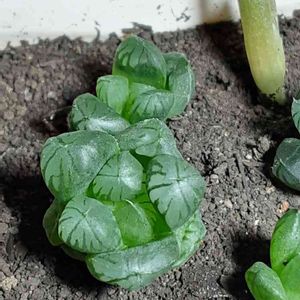 黒腐土の子株だね。 こだわりの子株?🕷 春に下葉から、斑入りの細胞とアントシアニンを、注入した子株だよ。細胞間移動があったのか?🧓 液胞細胞が白っぽいね。🕷 根は生えたが、なかなか葉が膨らまないし、広がらないね。🧓 キメラは成長しにくいよね。🕷 そうなんだ。成長すれば、普通のハオに戻る可能性もあるけどね。🧓 見守るしかないね。🕷