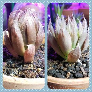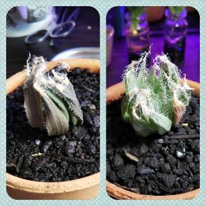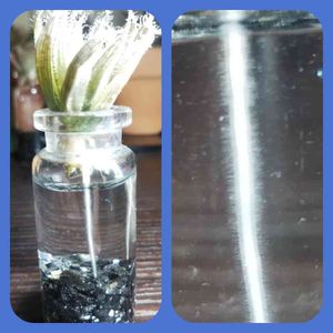 随分以前に、インテリア用に作ったハオ、ガラス容器だから、縦に間延び? 2年程度かな? 用土に植え替え。 この、歪さ可愛い😆 縦に間延びしてね🧓