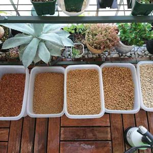 ベランダーを始めたころ用土は市販の多肉植物の土でした。 でも自分の環境、管理方法ではいい結果が得られず用土を作りはじめました。 右から軽石、赤玉土(大、中、小)、ベラポン(ヤシガラ)、あと欠品で写ってませんが鹿沼土を配合して植えてます。 水もちよくする為に観葉植物の用土を少量混ぜることも..... 基本的に灌水したがりなので水捌けよい用土で管理してます‼️ 皆さんはどうですか❔