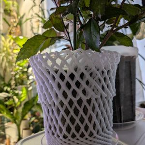 シャインマスカットのネットが5号鉢にジャストフィット レトロな鉢カバーみたいに… これでハイビスカスは冬越し🌺