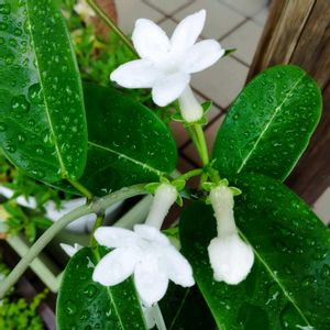 マダカスカル ジャスミン 雨の朝です 軒先でも、かなりの雨を浴びています
