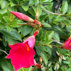 豪華な見本花を見て 育ててみたいと思ったサンパラソル👩🌾 購入してからのち、 やっと蔓が伸びてきて支柱を立てました 次から次へと休むことなく花を咲かせてくれてます 真っ赤な花びらはハイビスカスのようで、まさに夏の花!