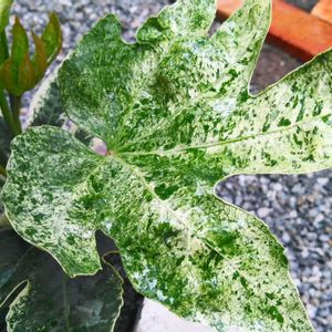 ヤツデ 紬絞り🌿 雨に濡れた斑入りの葉がとっても綺麗✨ 早く雨止まないかな~☔