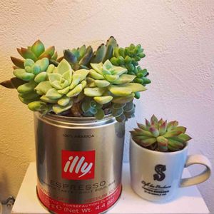 illyの空き缶とSeriaのデミタスカップに多肉寄せ植え。