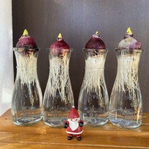 こんにちは☀️ ヒヤシンス🪻水耕栽培、開始から1週間。 根っ子出てきました❗️ 左⬅️から、青・紫・桃・赤の色になります。 色によって伸び方や根っ子の太さがちょっと違うかな🤔 初めて育てるアイスチューリップ🍨🌷。 11月24日に植えてから、もうこんなに葉っぱ☘️が‼️ 3種類、植えてあります。 いつ頃咲いてくれるのか、楽しみデス😊