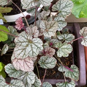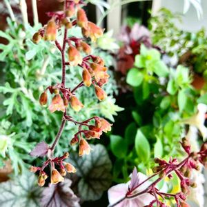 ヒューケラ☘️シナバーシルバー <追記> 赤く色づいてきました♫日影すぎるのかとても薄い赤ですが😅3年目でようやくお花が見れたので嬉しいです💕 この品種は赤いお花のはずなんですが写真の通りの色味で咲きました。違う種類なのか?それともこれから赤くなるのでしょうか?観察中です。 初開花🎶現在の葉っぱ、一緒に撮れなかったので下に載せました。グリーンのお花も良いけどね☺️ ̈❁* 花言葉 ❁*.゚ 恋心、きらめき、辛抱強さ