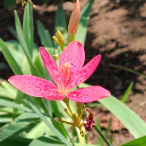 ダルマヒオウギ アヤメ科ヒオウギ属 今年の1番花です🙋 あまりに暑く、 花芽がなかなか伸びず、 今年は咲かないのかなと思っていました😆 よかった~❤️ この株は地植えしたものです🎵 もう1鉢のダルマヒオウギも咲きそうです💓 でも、ヒオウギは花芽がまったく出そうにありません😵 環境がかわると難しいですね😉 ヒオウギ大好き💕 今日は朝ドラらんまんを離れて投稿します🙆