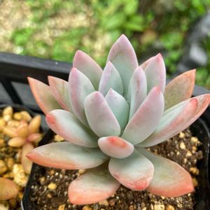 おはようございます。 うちに来てまだ3ヶ月だけど一回り大きくなったので植え替え。 淡い色に葉先だけほのかにピンクでお気に入り♡ 若干徒長ぎみだから日当たりの良い場所へお引越し〜。