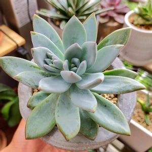 🍀霜の朝🍀 〘しものあした〙と読むそうです。 エケベリア属のカンテと パキフィツム属の星美人 との交配種だそうです。 別名 パウダーパフ なかなか美人の多肉さんです。💕 下葉がちょっとフニャフニャしてきました。😱😱😱 追記☆ 2022.7.5 気がつけば茶色くバラバラ事件になっていました。