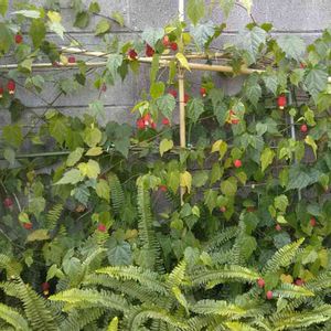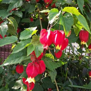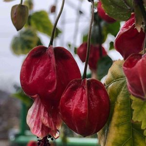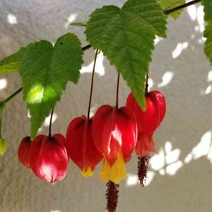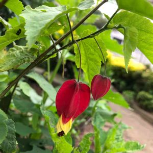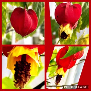 ❤️チロリアンランプ❤️ カラーシリーズ⑵❤️❤️❤️ アブチロン属 ウキツリボク 赤と黄色のコントラストが大好き😍 花は黄色の部分だよ❗️ 膨らんだ赤い5稜形の萼が花見たいでしょ😅 雄しべと花柱(雌しべ)は飛び出しています✌️ ツルが伸びて育っていきます🙋♀️ 今年は早く咲き始めました❣️