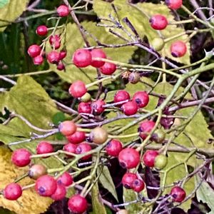 今日の早朝ウォーキングから ①ノイバラの実 ②③サザンカ 白花 ④バラ ⑤シコンノボタン