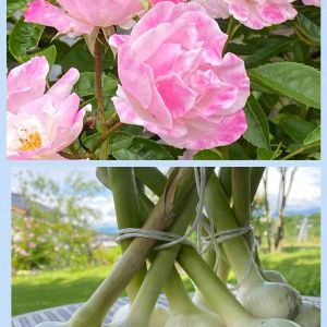 ピンクのミニ薔薇が咲きました💓 嬉しい収穫*ニンニク🧄 去年とれたニンニクを植えて 2年目の物です やや小ぶりでも大満足^ - ^✌️ ペペロンチーノ・ミートソテー ホイル焼き … 何にでも入れちゃいます オリーブ油や醤油漬けにも👍 嬉しい収穫です( ´∀`)