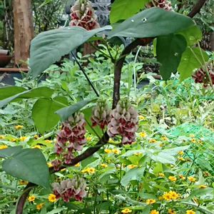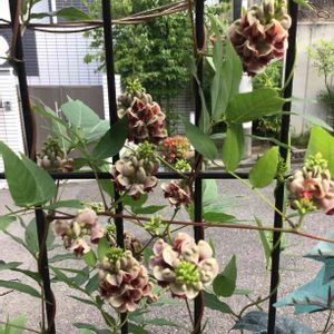 アピオス 何とマメ科なのに食べるのは塊根とのこと インディアンのスタミナの源と言われる,栄養満点💯 花だけ見て鑑賞用だと思ってました🤭