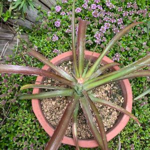 4代目 花パイナップル🍍 蕾が付きました♪ 亡き友の沖縄土産の エアプランツ 可愛そうで水に刺し土に そしたらパイナップルに👀 花芽が 😳 赤紫色の小さい 花が そしてミニミニ🍍に 😍 鑑賞用だから 食べられないけどねぇ〜😂🙂 脇芽を育て続けて毎年 咲かせてます🍍