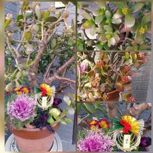 いつもは霜が降りない間にと、家の中にいれてたカネの成る木。重いので😄玄関前に置いてたら、紅葉してました。なんとかお正月らしくと葉牡丹を置いてみたんですが・・あと飾りだけ😌