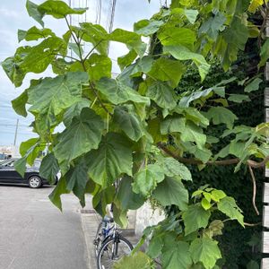 今日のお花、キリ 先週の観察会で出会ってました ひとりばえのようですね 2️⃣〜5️⃣は佐和山の麓散歩で出会ったアオギリ 4️⃣は大きなアオギリの木🌳で5️⃣で幹が緑色の2本がアオギリです。 落ちたお花のpicを2023.7.18に投稿していますが道挟んだ反対側に生えてきた大きな葉っぱと緑色の幹からアオギリとわかりました2️⃣3️⃣ キリのお花はまだ見られていないのでGSで拝見しています。
