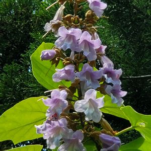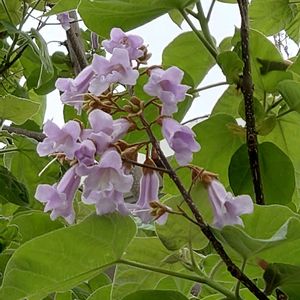 桐 キリ キリ科 キリ属 原産地 中国 🇰🇷 日本では宮崎県、大分県で自生が見られるが原産地は不明のよう。 花期 5〜6月 落葉広葉樹の一種。軽くて割れにくく、腐食にも強いので、家具や楽器などに使われる。 両性花で枝の先に淡い紫色の花を円錐状につける。 高い所に咲くことが多く花を見られなかったがたまたま低く下がった枝に咲いていて身近に見ることができた。