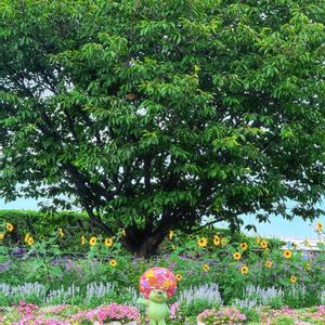 港の見える丘公園のガーデンベアちゃんの周りの花壇にもヒマワリ🌻 ガーデンベアちゃんの後ろにある横浜緋桜の木は緑がモリモリ茂っています🌳