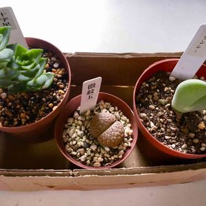 本日の収穫。 ベビーティアーズ、リトープス、多肉カット苗。 自転車だったため鉢がひっくり返り、あわれな状態になっていたリトープスw