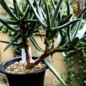 ■アロエ ラモシシマ Aloe ramosissima Pillans 原産地 ナミビア 南アフリカ 種小名は「たくさんの枝」という意味で、その名の通り幼苗のうちからよく分枝をする。老成株は高さ1.8メートルほどにもなる。枝葉はアロエ・ディコトマほどは密生しない。葉色は青磁色。野生では乾燥した土地に自生する。タイでも栽培可能だが、成長は遅い。栽培場所には雨避けの屋根が必要である。原産地では畜産と鉱山開発に脅かされ、稀少なツリーアロエとなっている。現在は、サイテスの保護対象植物に指定されている。 以上、多肉植物全書より。 今週はあっという間の5日間で、明日はもう休みですね。あと1日、頑張りまっしょい💪 最高気温32℃、最低気温24℃ (以下、乙庭HPより) スベスベとした質感の幹を露出させながら枝分かれして木立ちし、先端部だけにアロエ特有の多肉葉をつける砂漠的で珍妙な姿がたいへん魅惑的な、南アフリカ〜ナミビア原産のレアな木性の原種アロエです。 奇妙な樹形からとても人気の高い種ですが、生産量がとても少なく、入手困難なレア種です。 大型の木性アロエというと乙庭では他にアロエ ディコトマ種をご紹介していますが、成熟した大株になるまで枝分かれしにくく、太幹で大きく育っていくディコトマ種に比べ、本種 ラモシシマはより幹の感じも細く、枝分かれし易くコンパクトに育つ特徴があります。 アロエ ラモシシマは下葉を落として木立ちしていく不思議な樹姿と、ツルツル・スベスベした質感の幹がたいへん観賞価値が高くインテリアプランツとして人気のある種です。 生長は比較的ゆっくりめですが、枝数多く木立ちしてくると、本当に圧倒的な存在感を発揮して、彫刻作品のように不思議で空間的な美しさのある植物です。 姿もくずれにくく水やり手間も少ないので、インテリアプランツとしても管理しやすくおすすめです。 アフリカ原産の多肉植物ですので、日照を好みます。暗い場所で水を与えたりすると徒長して姿が崩れやすいので注意が必要です。 屋内であれば極力明るい場所に置き、水やりの頻度も少な目に管理すると徒長せず、締まった樹形を維持することができます。 耐寒性は2℃程度なので、日本では屋外越冬は難しく、主にインテリアプランツ扱いですが、春〜秋までは雨の当たらない屋外に出して、風景として庭の植物たちと合わせてみても楽しいです。 ニューサイランや、耐寒性バナナ、大型のアガベ、ユッカなどと合わせたらそれはもうド迫力のカッコよさでしょう! 冬季はほぼ休眠期となるのと、湿った状態での低温が苦手な植物なので、12月〜翌3月くらいまではほぼ水やりを停止し、乾燥させて管理するとよいです。 葉縁に棘のある肉厚の硬葉、露出した幹が作り出す造形美は本当に彫刻的で、庭の風景を引き締め、絶好のフォーカルポイントになります。 まさにオーナメンタルプランツの真骨頂!アーティスティックなお部屋・お庭にぜひ取り入れたい植物ですよね。