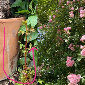 我が家一の花数を誇ったランブラーローズ・群舞🌹(→は昨年の姿) そろそろ10年近くになり、2階まで届く大株ですが、どうもこの春の芽吹きが悪い💦 そもそも鉢植えをそのまま根付かせ、これはもう地植えだな、と開き直って数年。 今回初めて鉢をよく見ると、ハンパない根詰まり🪴 でも鉢穴から出た根っこは見事な太さ😳 今季は諦めて、挿し木を沢山作って、冬に鉢を割って、超強剪定しよう!と覚悟を決めてました😤 今日改めて鉢元を見てみたら、鉢の外側に シュートが〜‼️🤣 ただ、鉢の中に蟻の巣ができていそうなことにも気づいてしまいました🐜 まだまだ奮闘は続きそうです😅