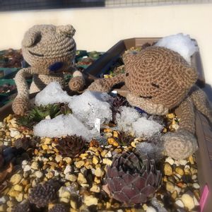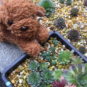 😆 仲間を増やそうと考えていたら、発見。 なんと!これ、15年以上前に犬の🐩プーちゃん作ったんだぁ。あの時は作れたのね。😅 昨日の冷たい雨でイキイキしてるるセンペル達と一緒に記念撮影(温和なねこきちくんに腕枕してあげてるの。)
