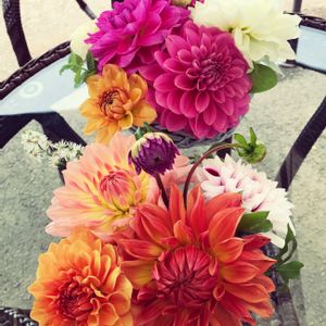 ダリア園の休憩所のテーブルにミニアレンジ❣️ ここから写真撮りまくるんだ💓 心拍数上がってるのがわかる💦 未だ出会えてなかった子達に会える期待と、そろそろ終盤だから傷みがあるのかな〜との不安と😅 友人と話しながら撮ってるのにお互いダリアから目を離さない( ⁼̴̶̤̀ω⁼̴̶̤́ ) 付き合ってくれてありがとう💕 なかよし♪( ´ー`)⊃⊂(´ー` )こよし♪