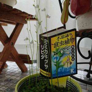 食虫植物 ミミカキグサ リビタ 11月25日に1番下が開花、その1ヶ月のちに真ん中が開花。今は3番目の花が開花。 この小さな花は3ヶ月近く咲いていることになります。 しかもまだ4番目の蕾がスタンバイ🙄 横から撮るとニヒヒと笑っているような不気味さ🙀 不思議花です。