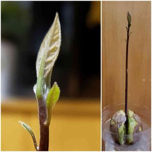 アボカドの芽が伸びてきました~ヾ(*´∀`*)ノ 小さいけど、葉っぱも付いてます( *´艸`)
