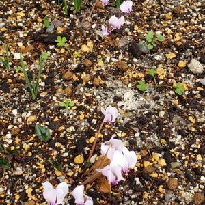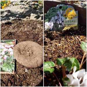 庭仕事② 植えっぱなしシクラメンも植えました( *´艸`) 左…手のひらサイズの大きなシクラメン・ネアポリタナム 右…咲き始めたガーデンシクラメンの傍にコウムアルバ 「初心者でも大丈夫」と言う言葉を信じて買い求めました(๑>ᴗ<๑)
