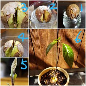 🥑アボカド 成長記録🥑 ①アボカドの種の水耕栽培始めました😀 ②種が少し割れ始めました💕 ③中に何か見えますよ~(๑´ㅂ`๑) ④あ!芽みたいのが伸びてきた( *´艸`) ⑤葉っぱも出てきました~(*´-`)❤️ ⑥水耕栽培から土耕栽培に変更☝️大きくなってね~(*'∀'人)♥*+ ここに至るまで、半年位かかってる…🐢💨💨 でも、木だもんねそれくらいかかりますよね~(๑´ㅂ`๑) これから寒くなるけど大丈夫かなぁσ(∵`)?