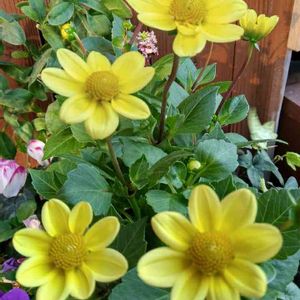✴️小輪多花ダリア✴️ スイートハート(イエロー)❣️ 葉牡丹さんが枯れ枯れになってしまったので、空いた場所に植えてみました😃 普通は土も替えて植えるのでしょうが、ドケチの私はそのまま植えました😅 先住花さんの根が張って植えにくかったけど、何とかつっ込みましたが…😄 さてさて、ちゃんと咲いていてくれるかなぁ?