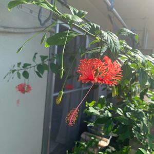 フウリンブッソウゲ(風鈴仏桑花) 今年は毎日6輪程🎐🌺ぶらぶら〜ゆらゆら〜咲いてます。 こんなに咲いたのは初めてです。蕾もまだ沢山、米粒みたいなのがどんどん出てきてます。 ベランダの外側にも内側にもどんどん延びて、物干し竿も占領…洗濯物はだんだんと端っこのほうに(・・;) 通る度に花粉が髪に😂 今年はフウリン🌺の当たり年なのか? ひどい風雨で自然のシャワーを浴びたのが良かったのか? ハイビさん他、南国植物が元気です٩(^‿^)۶