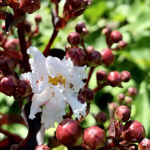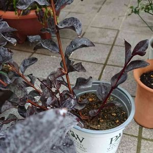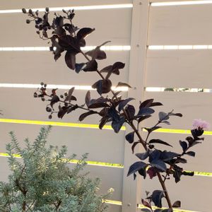 サルスベリブラックパール ホワイト 時々覗いてたHCで半額になってたコ💜 このコ何回か手にとっては戻しを 繰り返してたコなんです♡ᵎᵎᵎ 半額になっててポツンと待っていました😢 おいで、おいで。 場所はなんとかするから…。。 黒葉に白花…やっぱりお迎えしてよかった~✌︎
