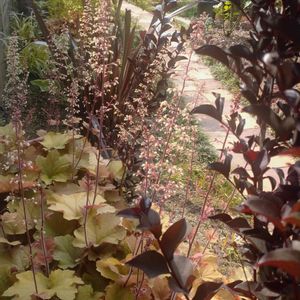 もうすぐ夏だってのに、うちの花壇は秋色😁🌰 ヒューケラのお花がツンツン伸びています😃⤴️ 銅葉のニューサイランと銅葉のサルスベリのコーディネートです🤤 大人の配色かな🤔