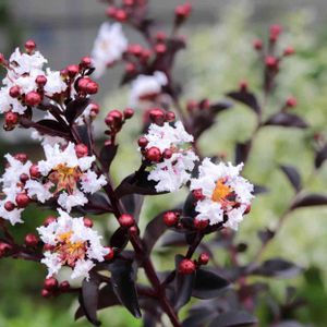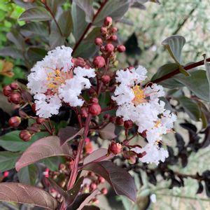 去年苗でお迎えしたサルスベリ ブラックパール咲き始めました 渋い銅葉に白、カッコいい✨✨✨ ブラックパールと聞くとジャックスパロウを思い出しますね