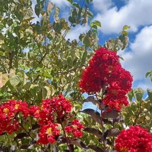 今日の❁⃘*.゚お花サルスベリ❁⃘*.゚ 台風がくる前 一昨昨日の裏庭にて 📸 うちの植物の中で一番の黒葉が 一際目立っています✨ 特に赤花は情熱的なレッド❤️ 昨日の激しい雨風に晒され お花まだ残っているかな❁⃘*.゚