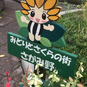 2018.7.6 みどりとさくらの街さがみ野。 歩道の花壇。 サルビアと座間市のキャラクターざまりん。座間のひまわりにちなんだキャラクターです。