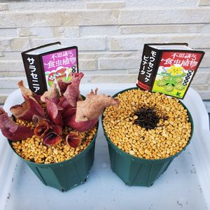 スイカさんのpostを見て、我が家も食虫植物たちの植え替え🪴 実は先月にホムセンで食虫植物の寄せ植えを見つけたのですが、かなり弱ってるのに金額がまあまあしたのでいつか値下げになるかと通ってました。 毎回、サラセニアの恐らくプルプレア?の中に水を入れられてるので毎回抜いて見守ってましたが、モウセンゴケが弱ってきてたのでついに購入。 タンクかなんかと間違ってる?なんで水入れる💧 いいサイズの鉢がなかったので、今回小さい縦長の鉢に植え替えました。 うちはベラボンメインのねこチップに植えて、入れ物にねこチップベットを作ってそこにいれてます。 簡易温室ですが寒さにはモロ当たるので、越冬してもらおうと思います!