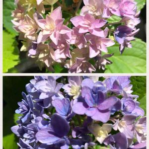 鉢植えの1株から、ピンクと青の花アジサイが咲いています。 このあと、ピンクも青くなるのか、はたまたこのままなのか。
