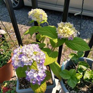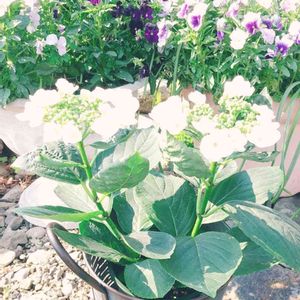 ネット通販で買ったフラッペ。 紫色×白と掲載されていたのに薄い青×白で来たので苦土石灰をまいてみた。もう遅いかと思ったけど、けっこう紫色に変わった✨