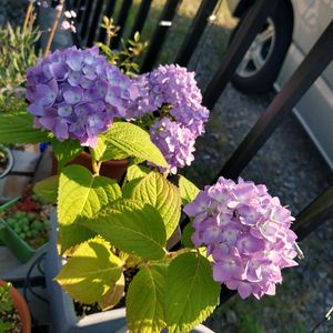 去年買ったときはピンクでかわいかったけど、今年は紫に。 鉢で普通に育てるとアジサイは青系だね。
