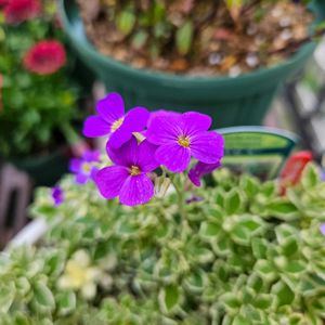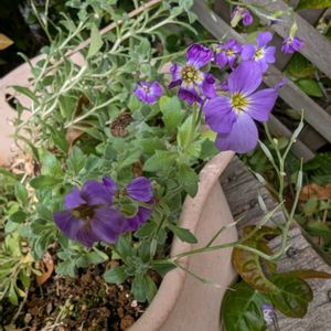 パッと目をひくパープルに目がくぎ付け👀‼ オーブリエチア💜 オーブリエタともいうのかな 斑入りの葉っぱも美しいです✨ 寄せ植えにイン!しましたよ(*ˊᵕˋ*)੭ ੈ
