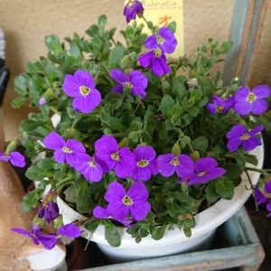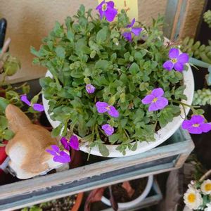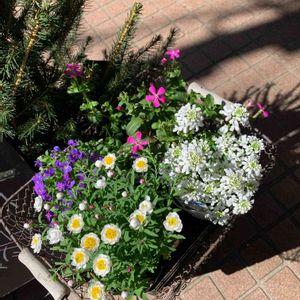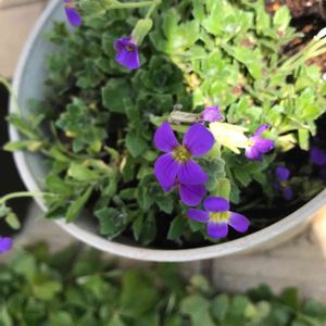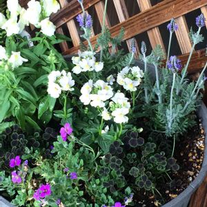 白と紫で寄せ植えを作ってみました。見にくいですが、紫っぽいクローバーを足元に植えてあります🍀 オーブリエチアは宿根なのですが、購入してすぐに植えたのにナメクジがいてかなり黄色くなってて、退治してちょっと持ち直したかな?頑張れ、オーブリエチア!