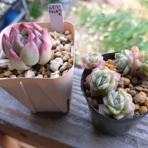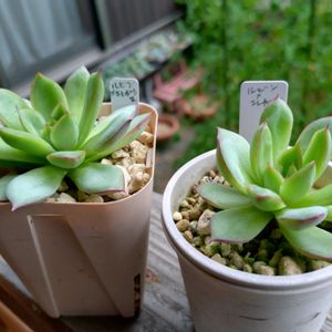 大事に育てている葉挿し。 ロメオルビン✕エレガンス。 買ったときに茎がジュレていて、すぐに葉っぱだけにした子。 昨年の11月からの付き合いです😅 2種類あって、こちらはエレガンス顔。 ジュレに気づいて、保険株として買い直したのが2枚目の子。 こちらはアガボイデス顔。 それぞれ特徴は違うけど、今ではどちらもお気に入り。 ちなみに、アガボイデス顔の方は子株が出やすいです。