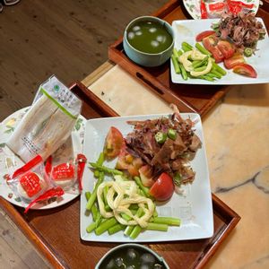 お昼ご飯 サンドウィッチ、ファミマ ミニカマンベール。花畑牧場 グリーンアスパラガス。マヨ トマト、塩 オクラ、生、鰹節、醤油 塩粉冷茶