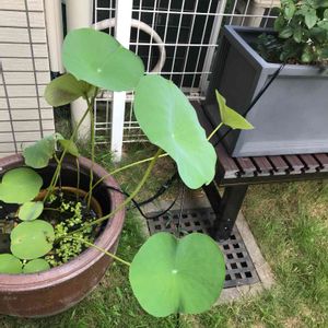 細い根と葉っぱ一枚から再生に向けて頑張っている大賀ハスです❣️ 今はメダカの日除けとして大活躍‼️